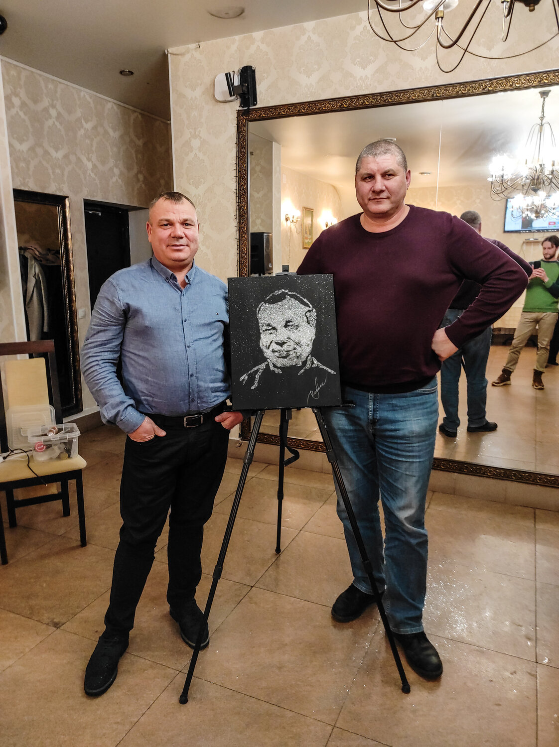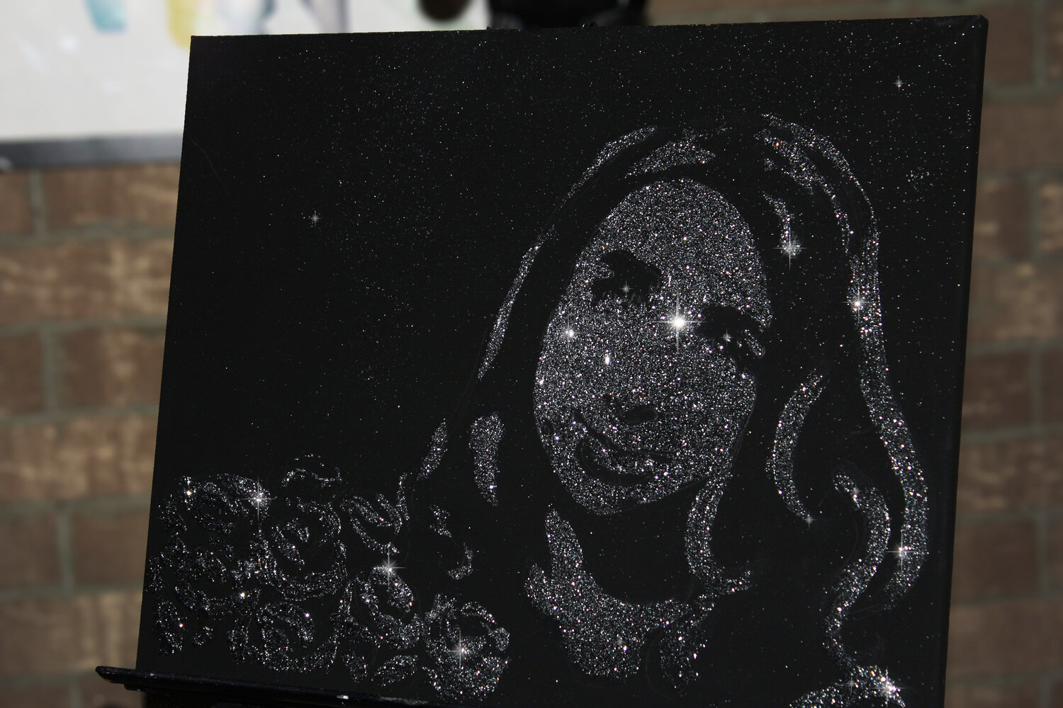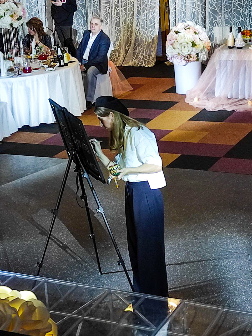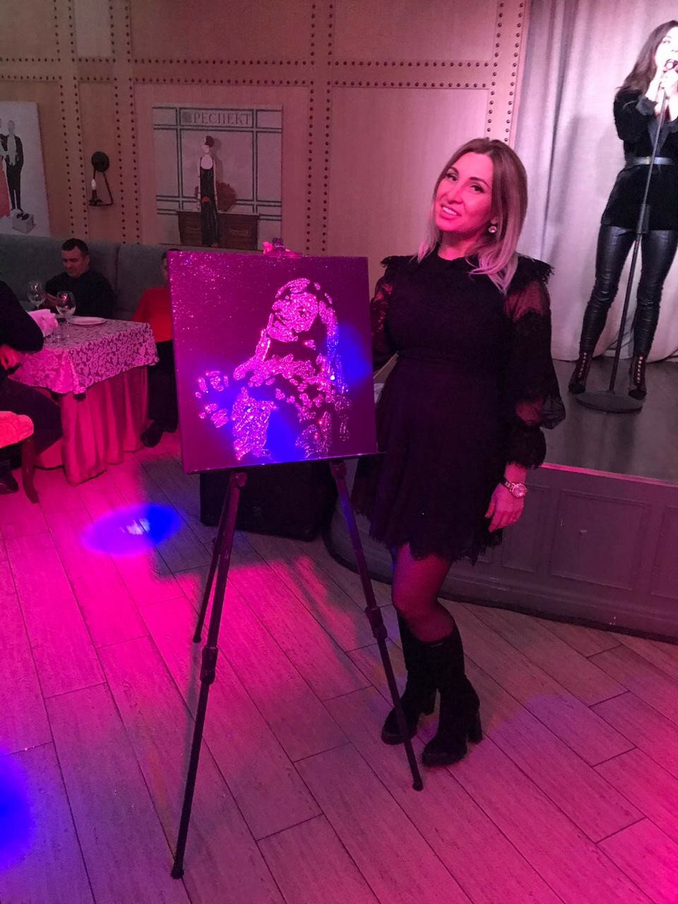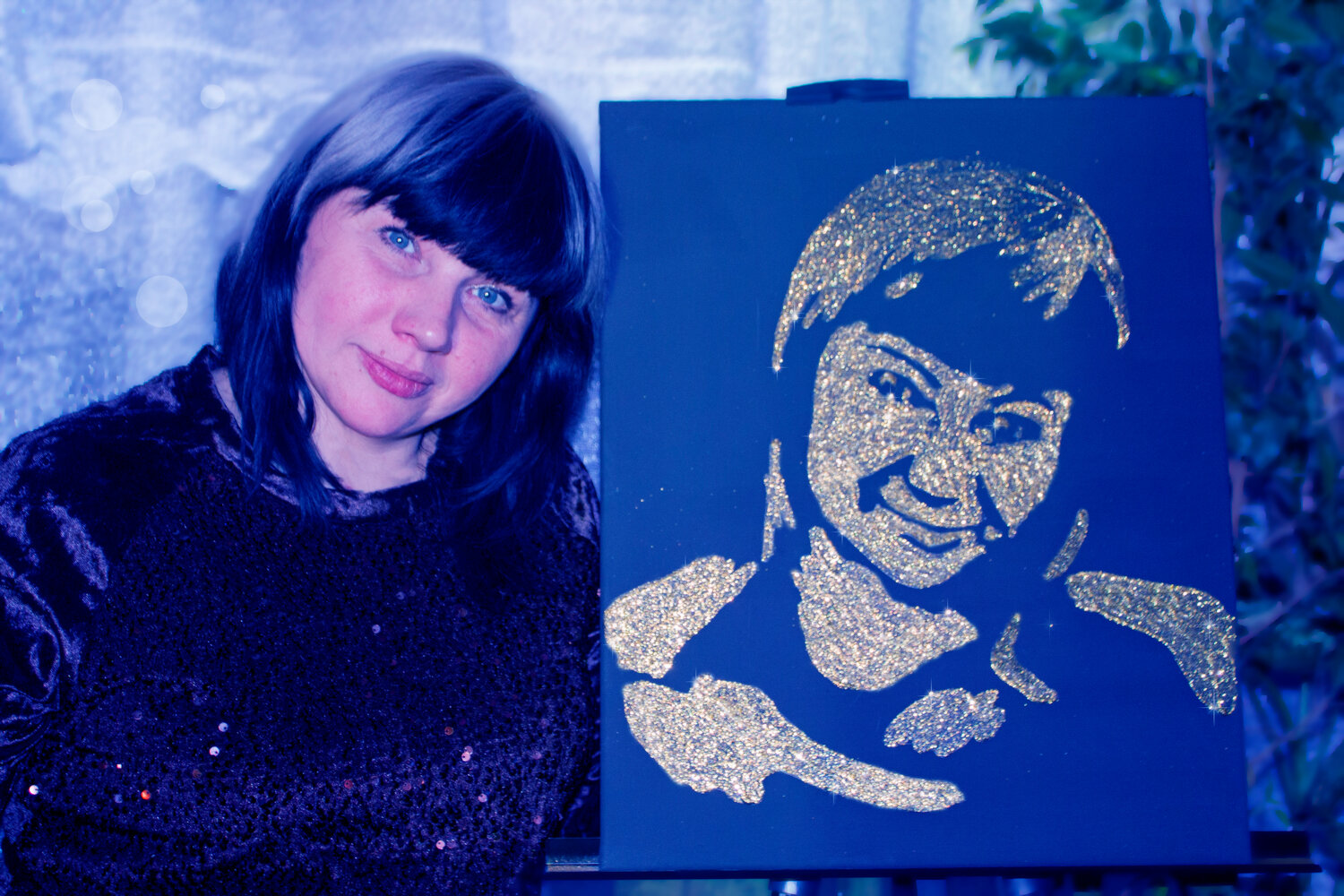 На глазах у изумленной публики я создаю на черном холсте невидимый эскиз. Когда всё готово, я приглашаю виновника торжества (или гостей) для завершающего волшебного жеста! Вместе мы раздуваем облако серебряных блесток — и в один миг проявляется сияющий портрет! Восторг, эмоции и незабываемые впечатления гарантированы.